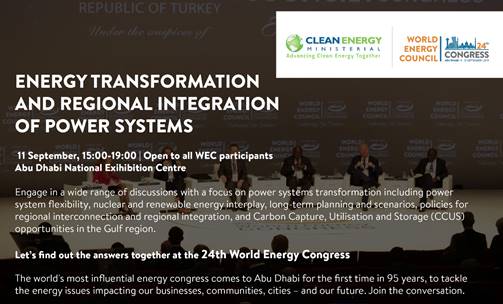 At the invitation of the UAE government, the Clean Energy Ministerial (CEM) Secretariat in collaboration with CEM workstreams is convening a side event at the 24th World Energy Congress in Abu Dhabi, United Arab Emirates. The CEM event will showcase six of its areas of work, which focus on the transformation of power systems. During this event, CEM workstreams will offer their perspectives on regional integration of power systems, each focusing on unique aspects and angles, which are central to their work. Several CEM member governments as well as private sector companies will speak at the event. The UAE government is actively engaged in these CEM workstreams and will offer its national and regional perspectives. The sessions will be framed and moderated by CEM Operating Agents/Coordinators, including IEA, IRENA, NREL, and GEIDCO. For more information please contact Ellina Levina, Partnerships Manager at the CEM Secretariat: Ellina.Levina@cemsecretariat.org